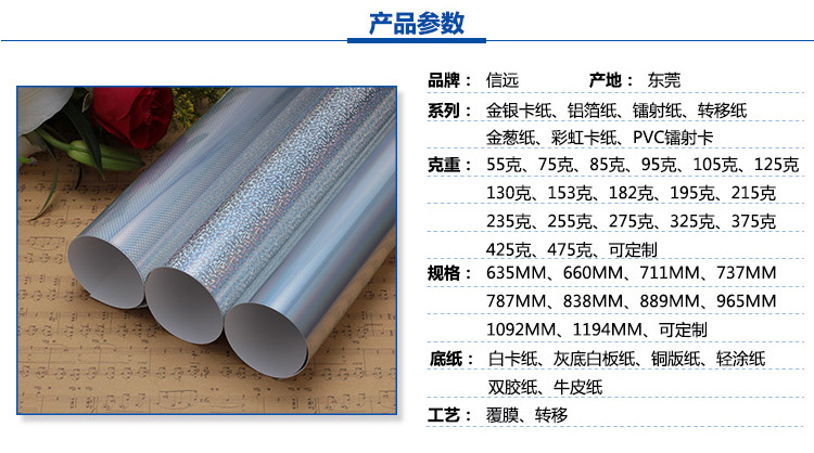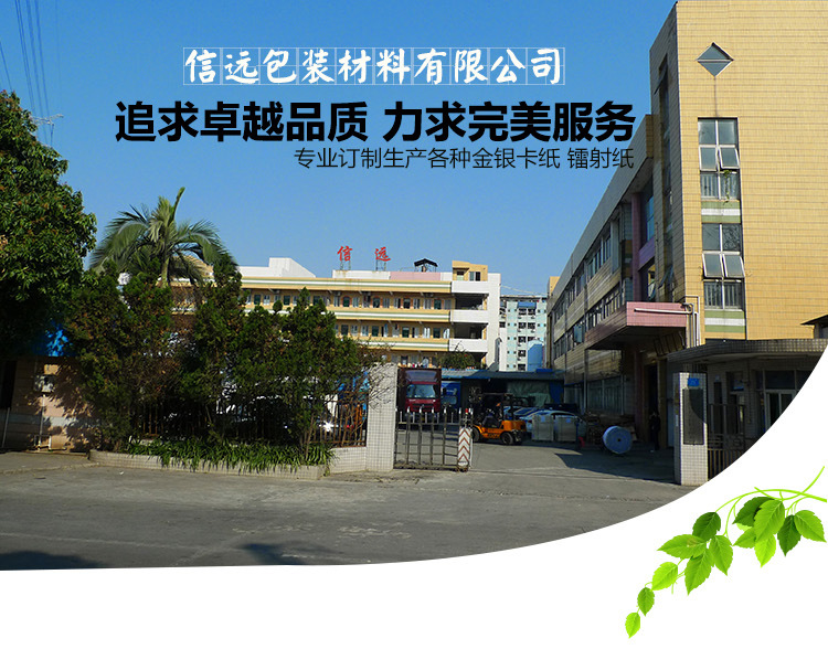 东莞市信远包装材料有限公司是东莞第三家生产金银卡纸和镭射卡纸,铝箔纸,PVC等塑胶复合材料的企业,具有16年的专业生产经验。拥有很强的研发实力,我司现有复合设备叁台,不干胶涂步机设备一台,电脑分切机叁台,电脑复卷分条机一台,我们所有产品都照ISO9000标准生产,所有产品已通过国际认照机构SGS的认证,符合欧盟ROHS、ASTM、EN71-3、REACH185项,16P等要求。为了更好满足客户要求,我司于2018年9月取得FSC认证。16年生产经验,所有你可能遇到的问题,我们都已经碰到过,我们所有产品能通过72小时高低温测试不起泡不离层;印刷适应性能非常好,如果印不上所有印刷上机费我司买单。